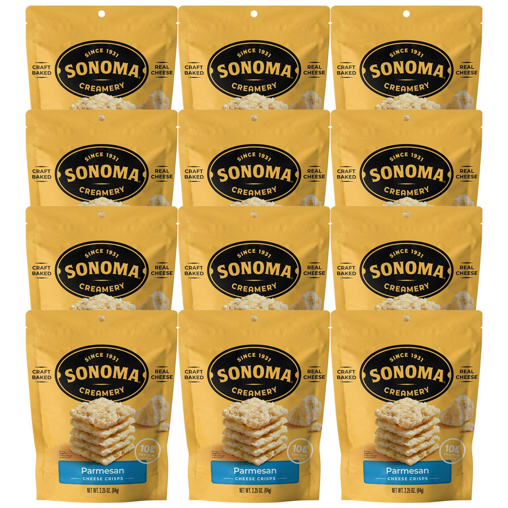 Sonoma Creamery Parmesan Cheese Crisps are baked, never fried crunchy Real Cheese Snacks. We use only 100% 10-Month Aged Parmesan Cheese made with milk completely free of artificial hormones. Our Crisps provide a gluten-free, low carb alternative to your morning routine or afternoon snack. Packed with flavor and oh so snackable, our Parmesan Cheese Crisps are sure to be a crowd pleaser.